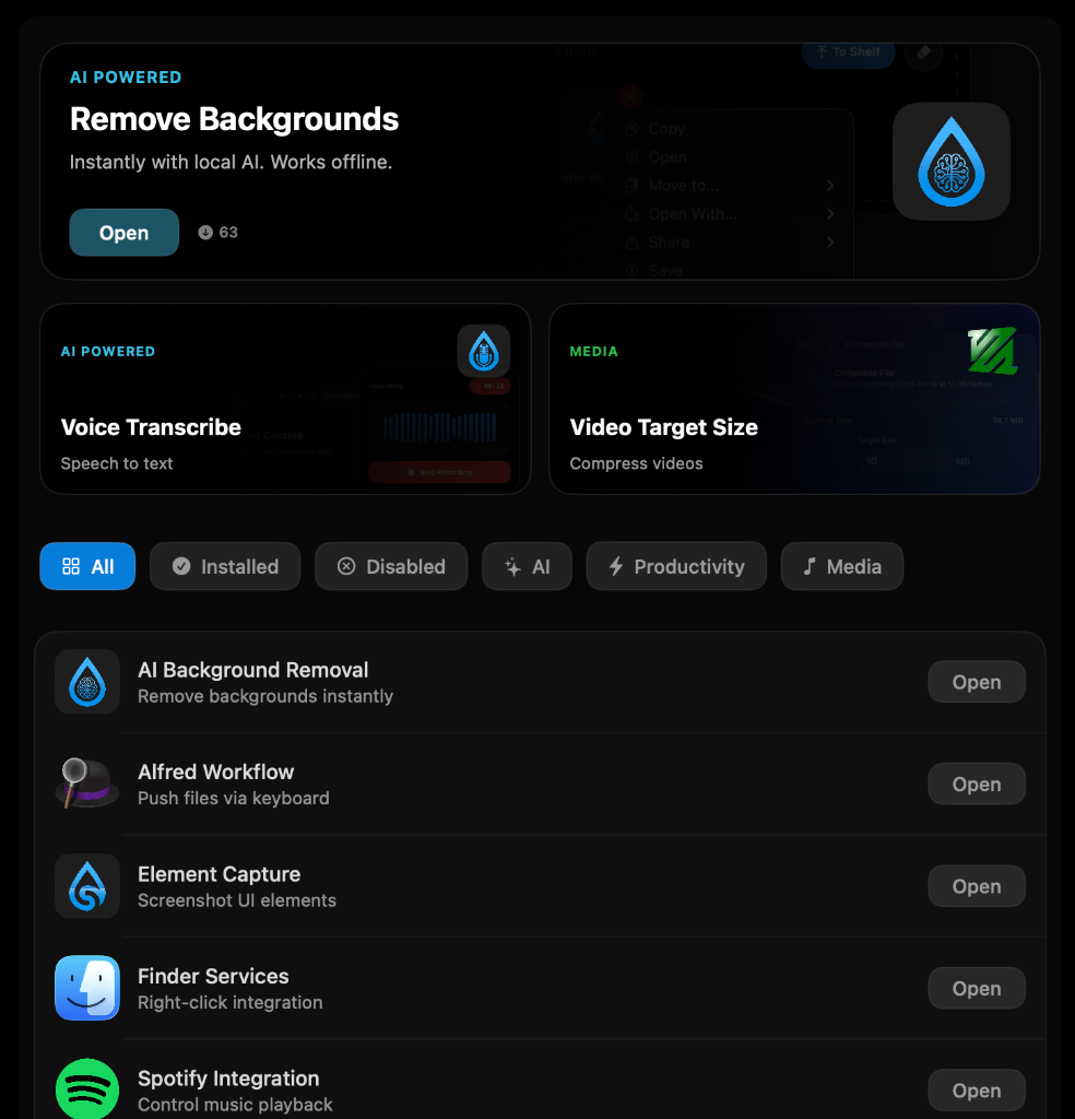 AI Background Removal, Alfred Workflows, Apple Music, Element Capture, Finder Services, High Alert, Spotify Integration, Voice Transcribe, Window Snap, Video Target Size, Termi-Notch, Notchface, Droppy Quickshare, Notify me!, Reminders, and Menu Bar Manager.